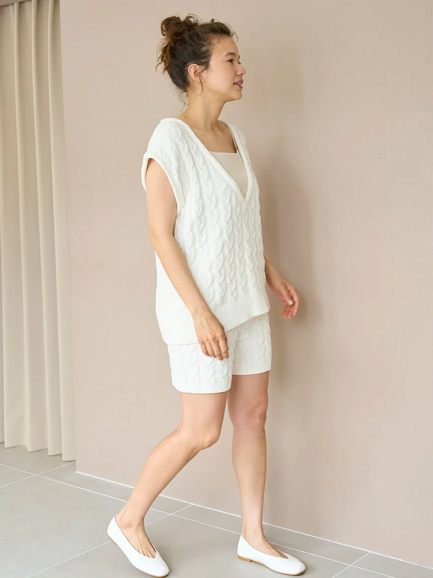 The Aran Knit Shorts offer a delightful blend of comfort and timeless style. Featuring a classic cable-knit pattern, these shorts are crafted from ultra-soft, plush fabric, making them perfect for lounging at home or running casual errands in style. The elastic waistband provides a secure and comfortable fit, while the longer length offers just the right amount of coverage. Available in a light ivory hue, the intricate knit detailing brings sophistication to this casual piece. Pair these shorts with the matching sleeveless top for an effortlessly chic look that blends comfort and elegance seamlessly. Whether you're enjoying a cozy day indoors or stepping out for a laid-back afternoon, these knit shorts will quickly become a wardrobe favorite.